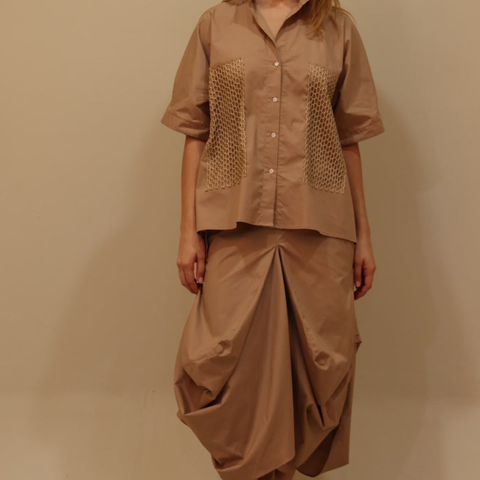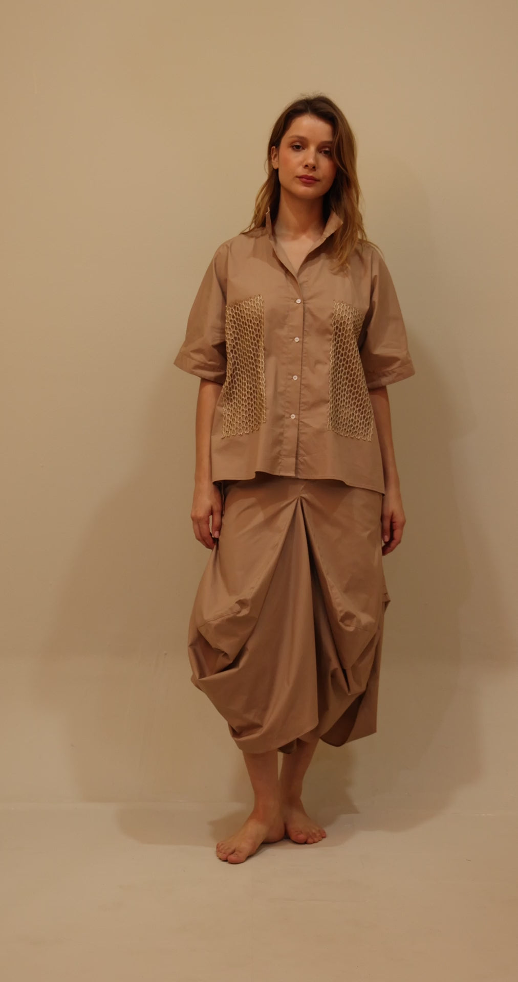 Camisa de corte oversize, manga corta con pliegues, bolsillos gigantes de parche en malla y más larga atrás que adelante.  ¡De esas prendas de corte masculino, frescas y cómodas que van bien con casi todo!