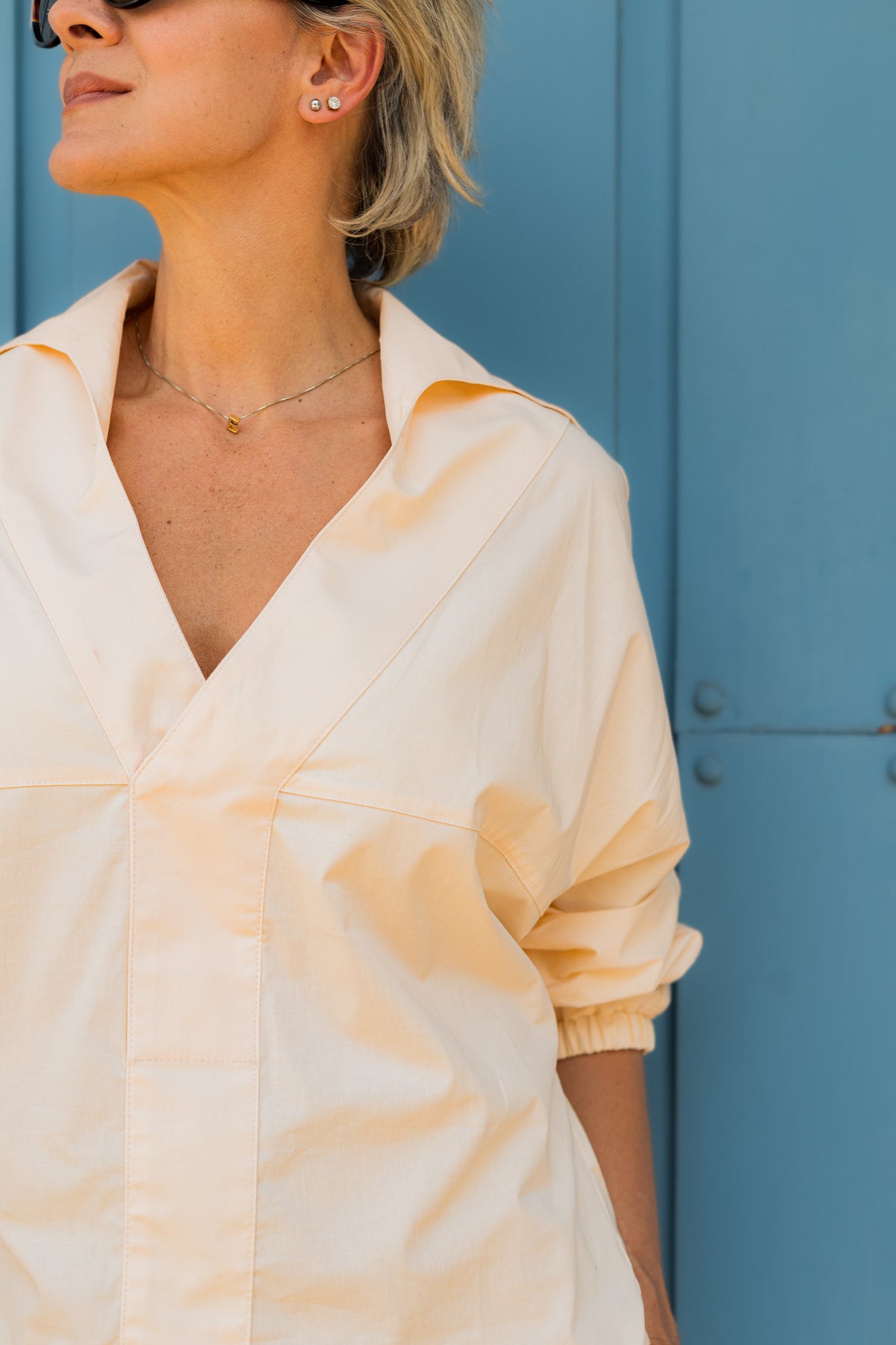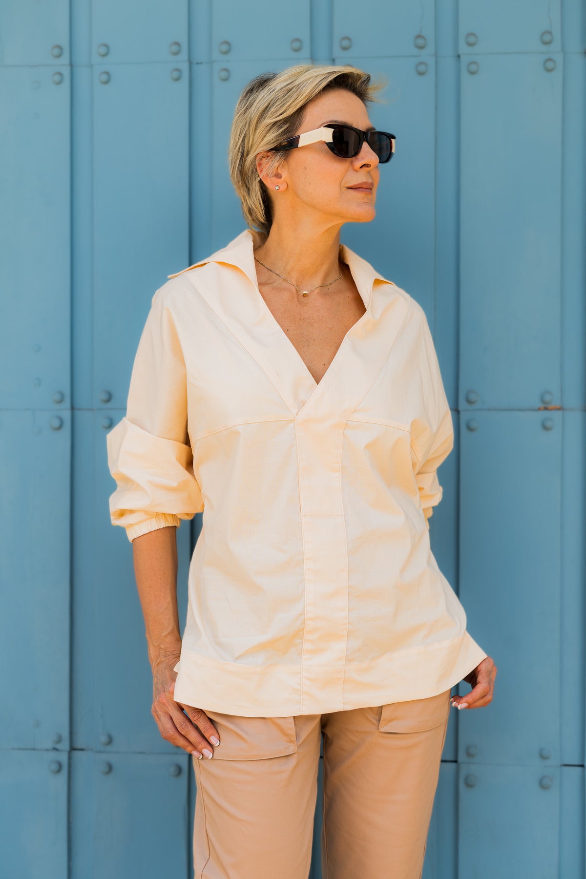 Camisa escote en V con cuello, manga ranglan terminada con resorte y largo tres cuartos. Con pieza al final y aberturas laterales para usar por dentro o por fuera ¡Ideal para tenerla en el closet y combinarla tanto para ocasiones formales o informales con jeans!