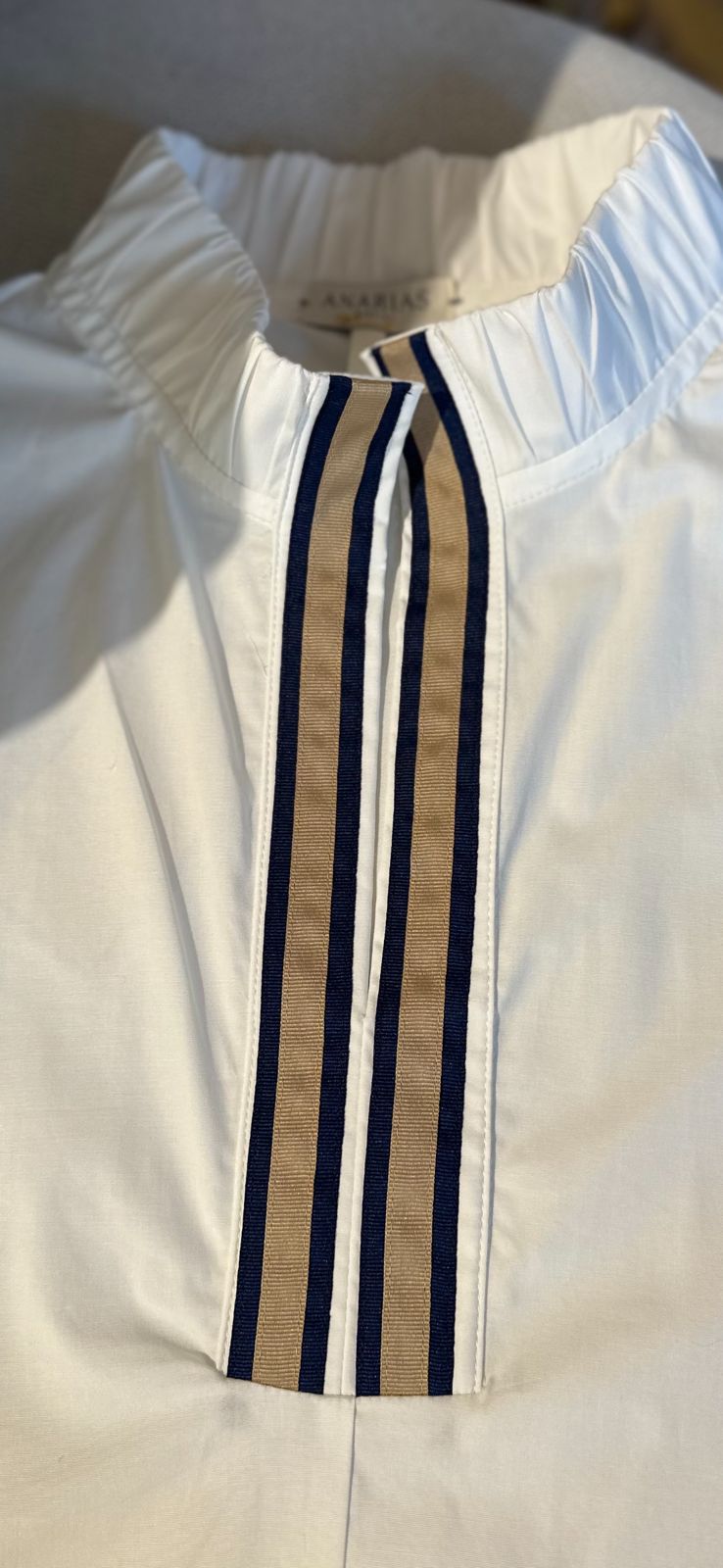 Camisa oversize, manga tres cuartos con resorte para usar caída o recogida en el hombro para dar más volumen, cuello alto enresortado y con cinta en contraste en el escote. El principal atractivo de esta prenda está en todos los detalles que la hacen clásica pero no convencional, ideal para ocasiones donde queremos sentirnos especiales pero sin pensar demasiado.