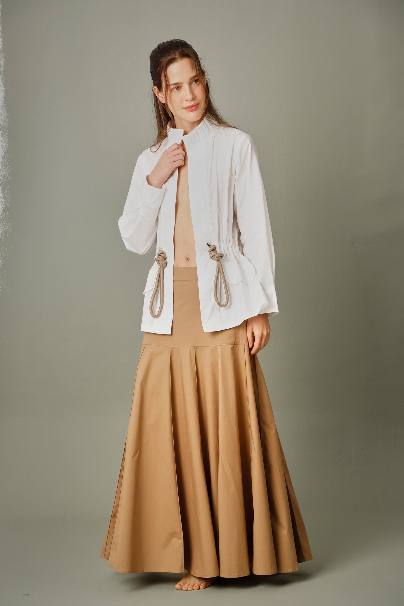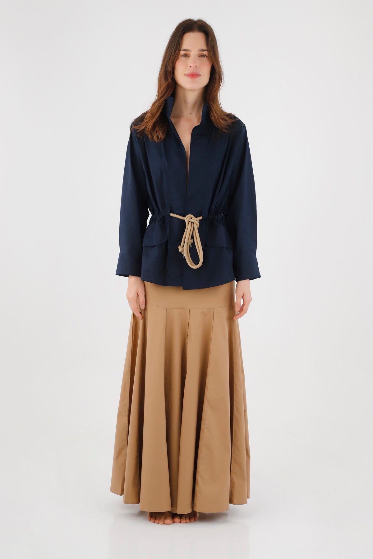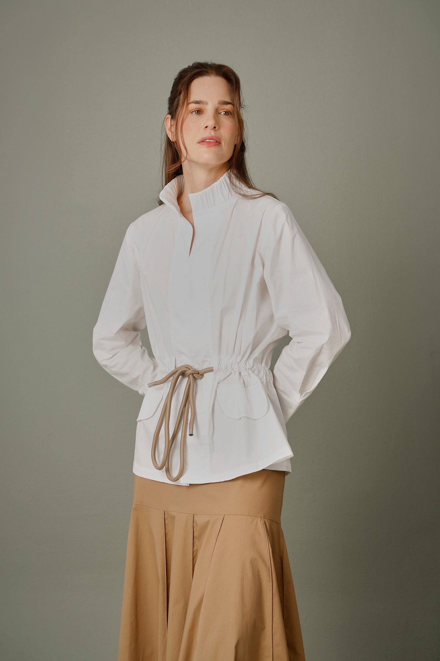 Chaqueta liviana tipo camisa, de cuello alto enresortado, sin abotonadura, con tapas que simulan bolsillos, manga larga con pliegues que abajo que generan ajuste, corte en la cintura y cordón con punteras plateadas para zurcir y ajustar.   Úsala sin nada por debajo o si prefieres con una básica de tiras para más comodidad.  ¡Esta silueta vuelve una vez más porque se convirtió en uno de nuestros básicos ya que es una de esas prendas que solucionan, funcionan bien para looks informales o formales dependiendo de los accesorios con la que la combines!