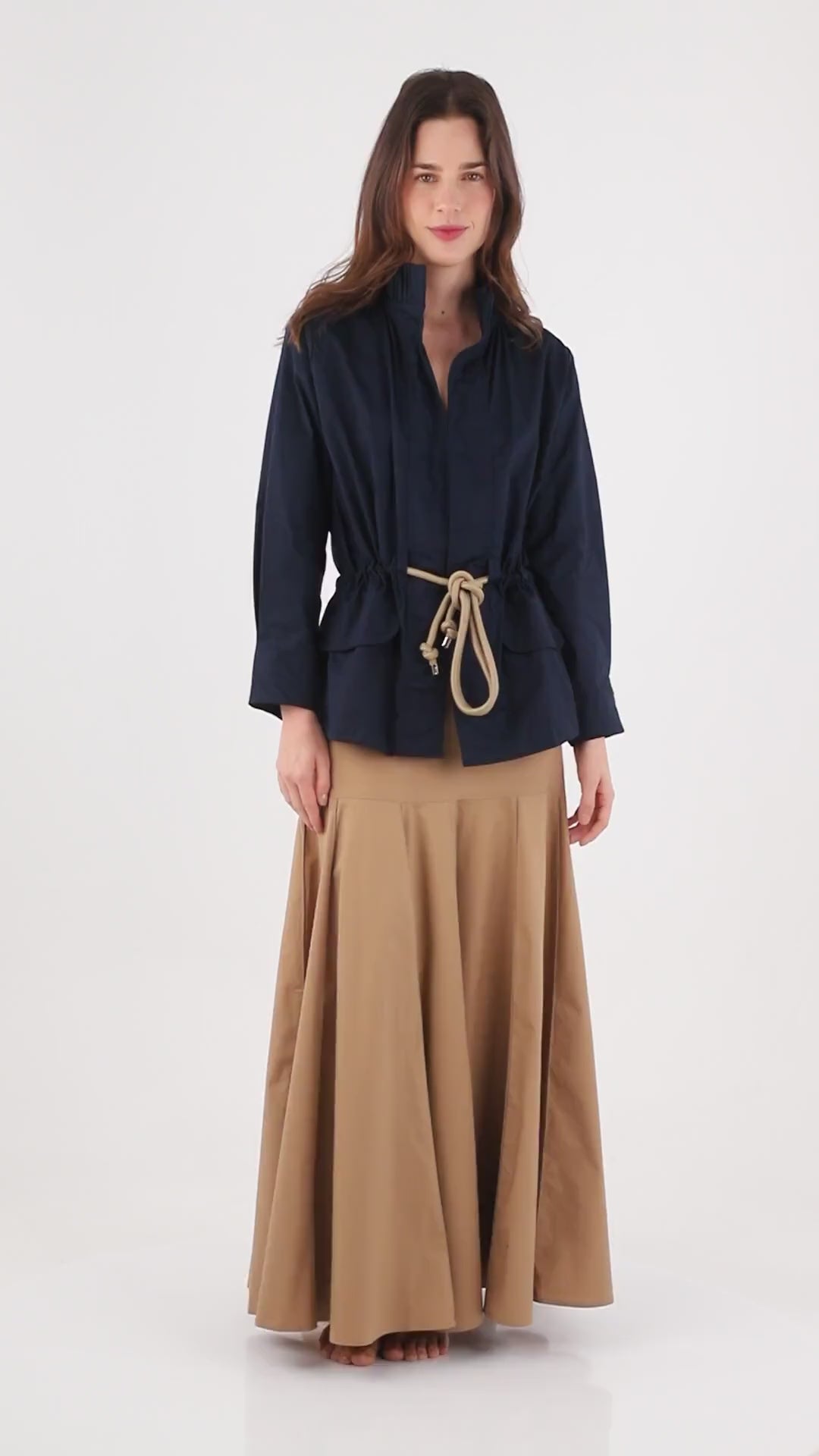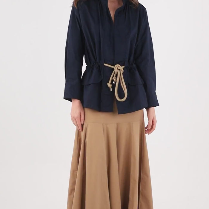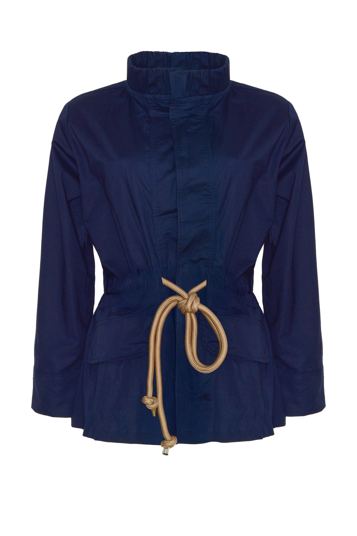 Chaqueta liviana tipo camisa, de cuello alto enresortado, sin abotonadura, con tapas que simulan bolsillos, manga larga con pliegues que abajo que generan ajuste, corte en la cintura y cordón con punteras plateadas para zurcir y ajustar. Úsala sin nada por debajo o si prefieres con una básica de tiras para más comodidad. ¡Esta silueta vuelve una vez más porque se convirtió en uno de nuestros básicos ya que es una de esas prendas que solucionan, funcionan bien para looks informales o formales dependiendo de los accesorios con la que la combines!