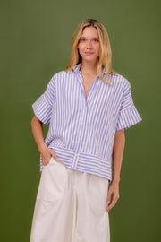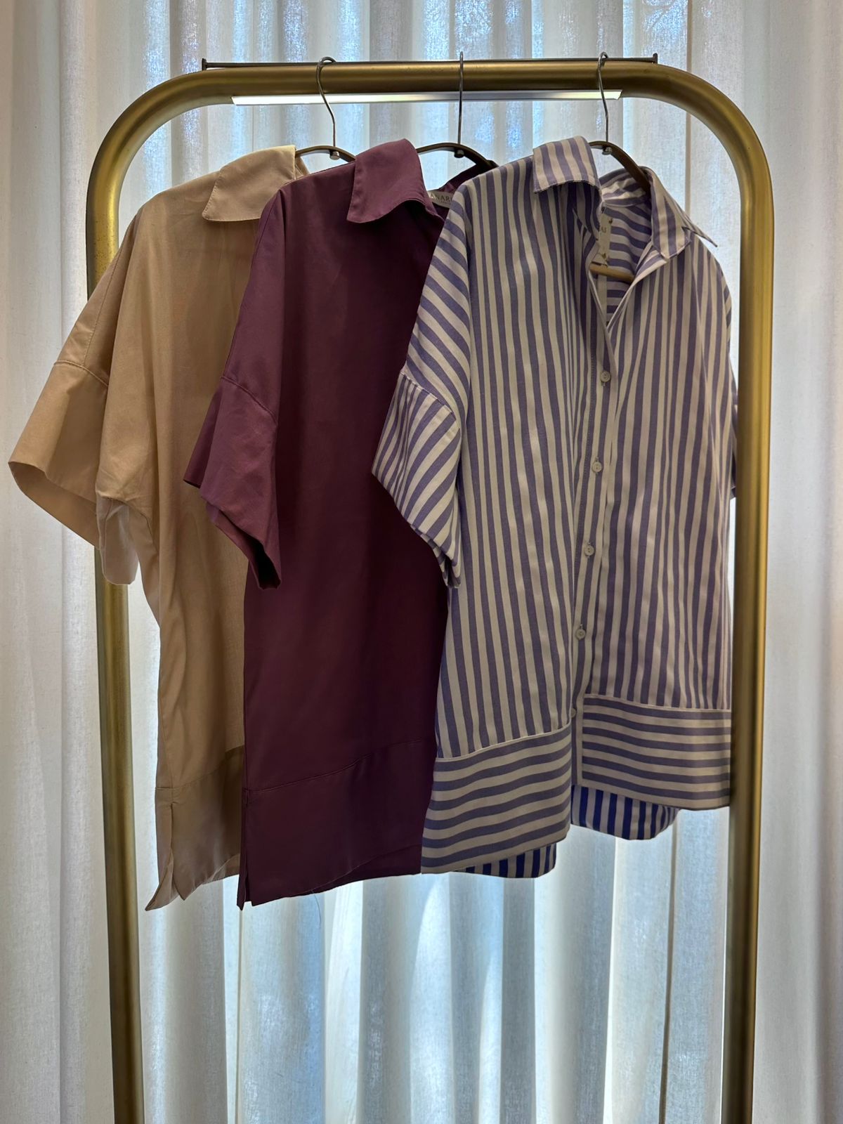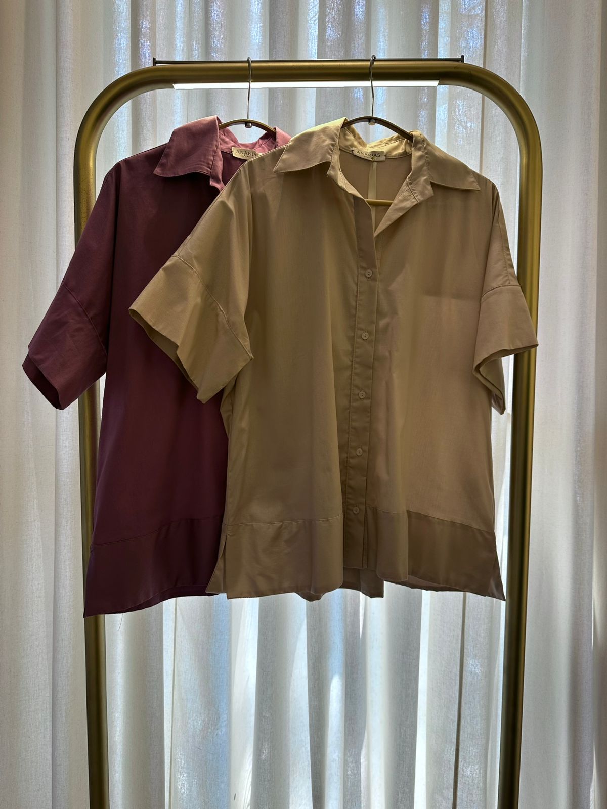 Camisa de cuello camisero, manga corta, abotonadura escondida, prense trasero y pieza gruesa abajo. Esta es una de esas camisas de líneas simples pero sus detalles en las mangas y en la forma en la que termina abajo la hacen especial e ideal para usar en el día a día!