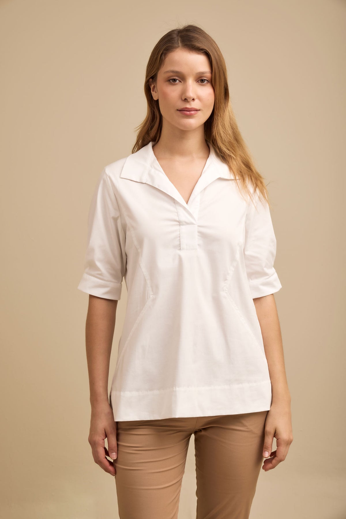 Camisa de cuello alto para usar doblado o parado, manga corta con pliegues, cortes adelante y aberturas laterales. Esta es una de esas camisas frescas, de líneas simples pero sus detalles la hacen no convencional y la convierten en la prenda ideal a tener para esas ocasiones donde no queremos pensar mucho, pero queremos sentirnos especial.