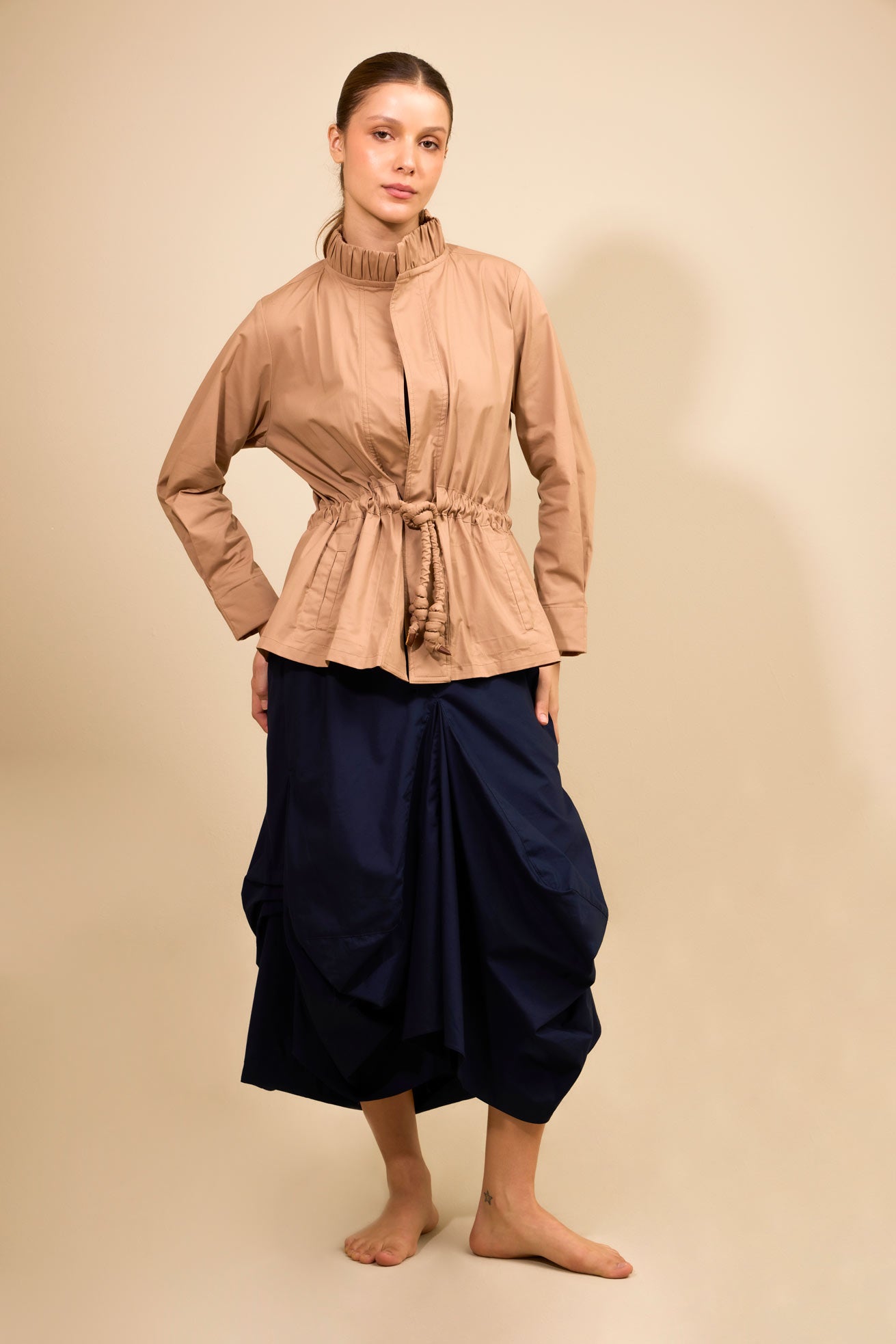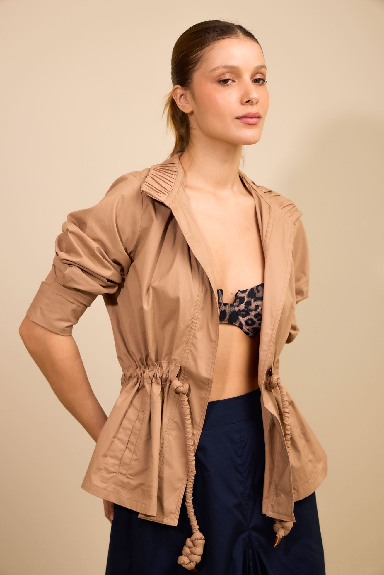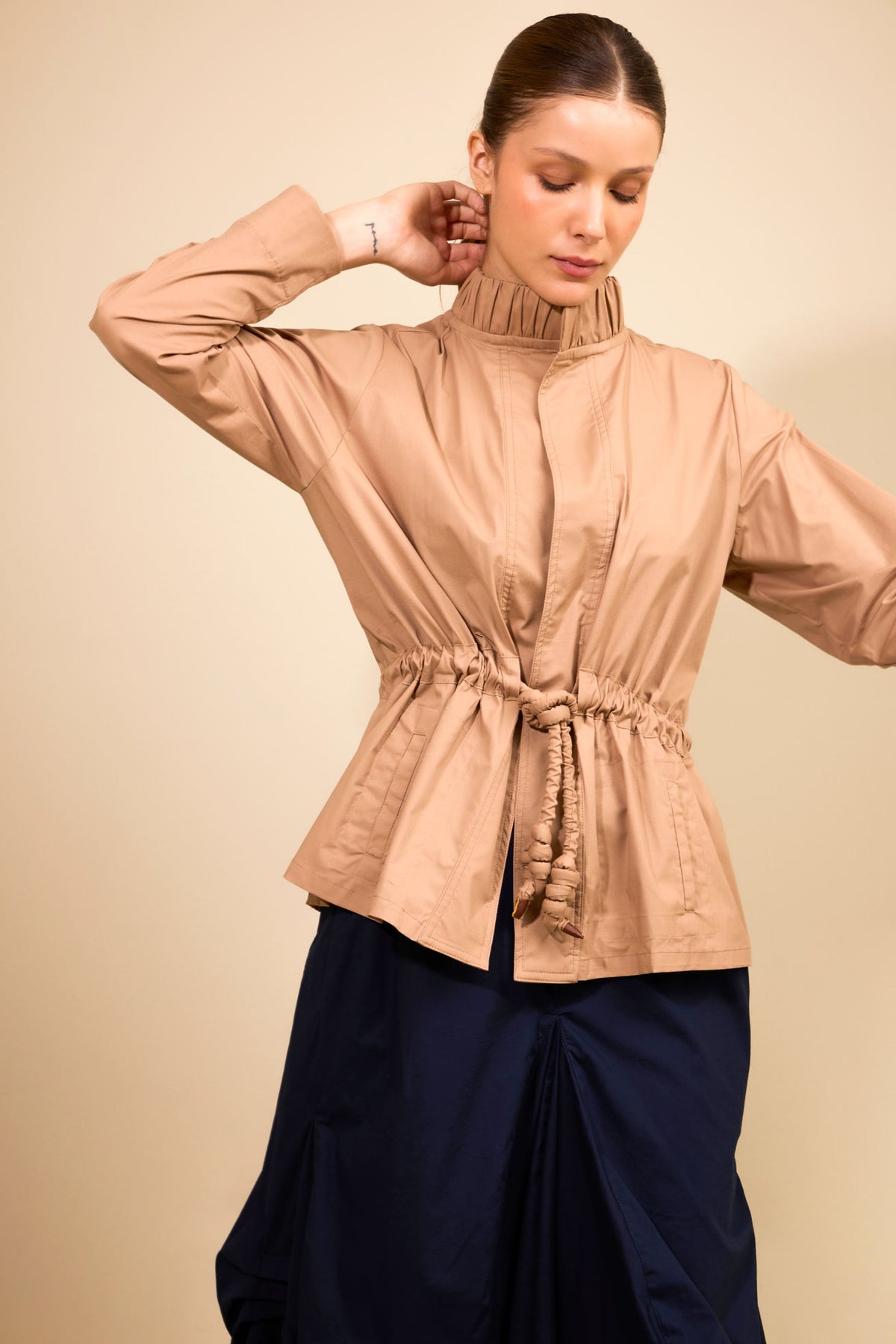 Chaqueta liviana tipo camisa, de cuello alto enresortado, sin abotonadura, con bolsillos de ribete, manga larga con pliegues que abajo que generan ajuste, corte en la cintura y cordón a juego, zurcido con punteras de cuero para ajustar. Úsala sin nada por debajo o si prefieres con una básica de tiras para más comodidad. ¡Esta silueta vuelve una vez más porque se convirtió en uno de nuestros básicos ya que es una de esas prendas que solucionan, funcionan bien para looks informales o formales dependiendo de los accesorios con la que la combines!