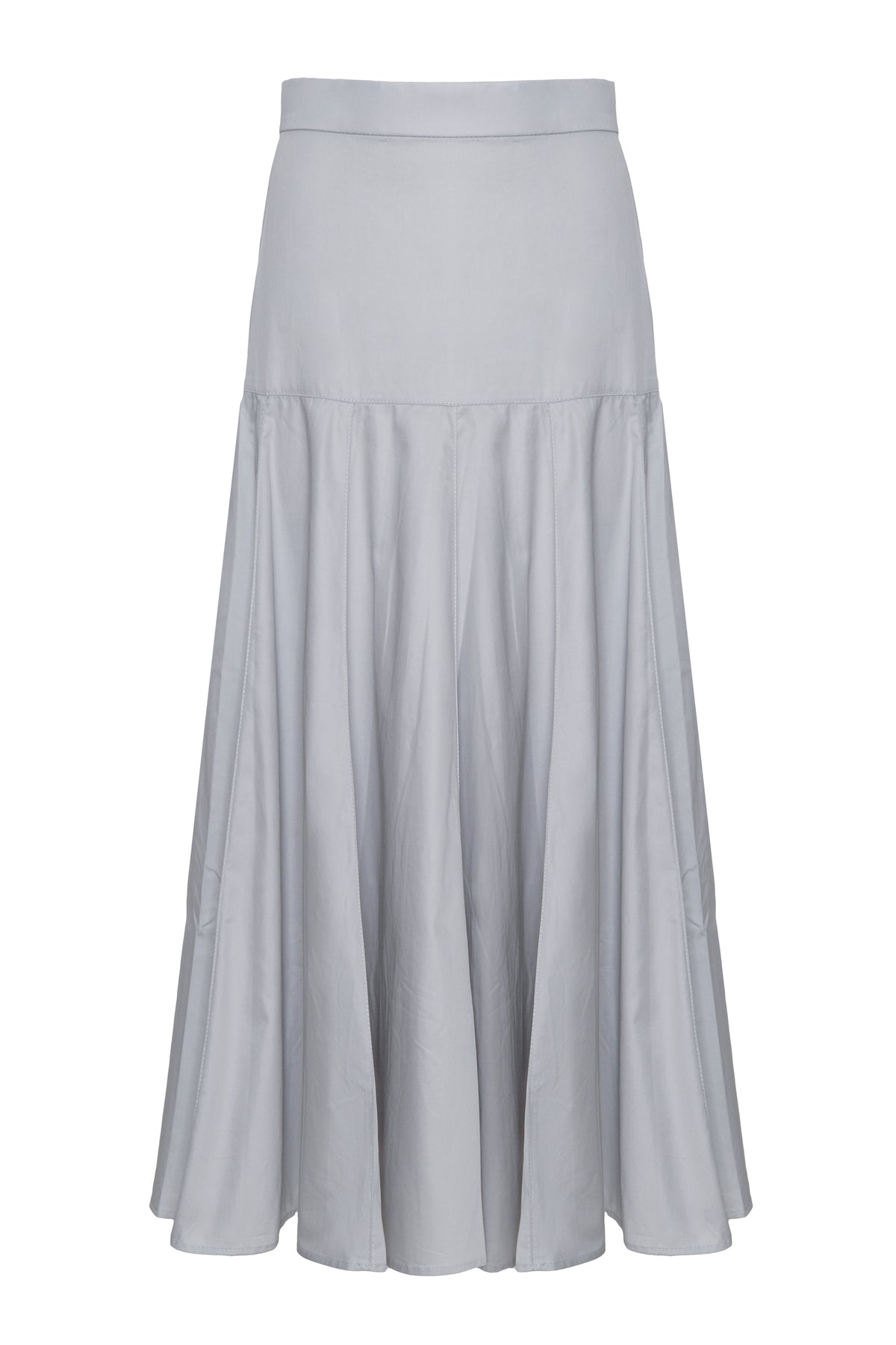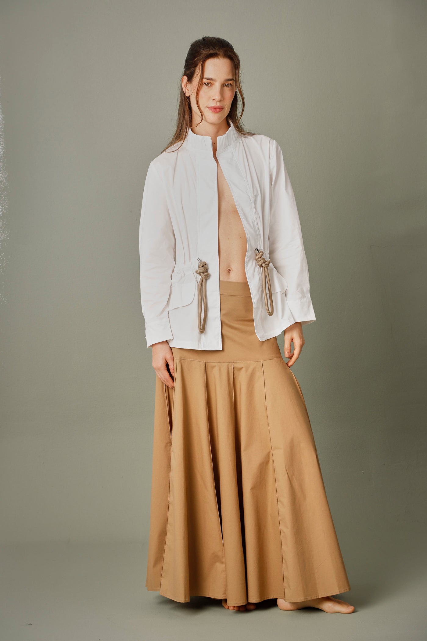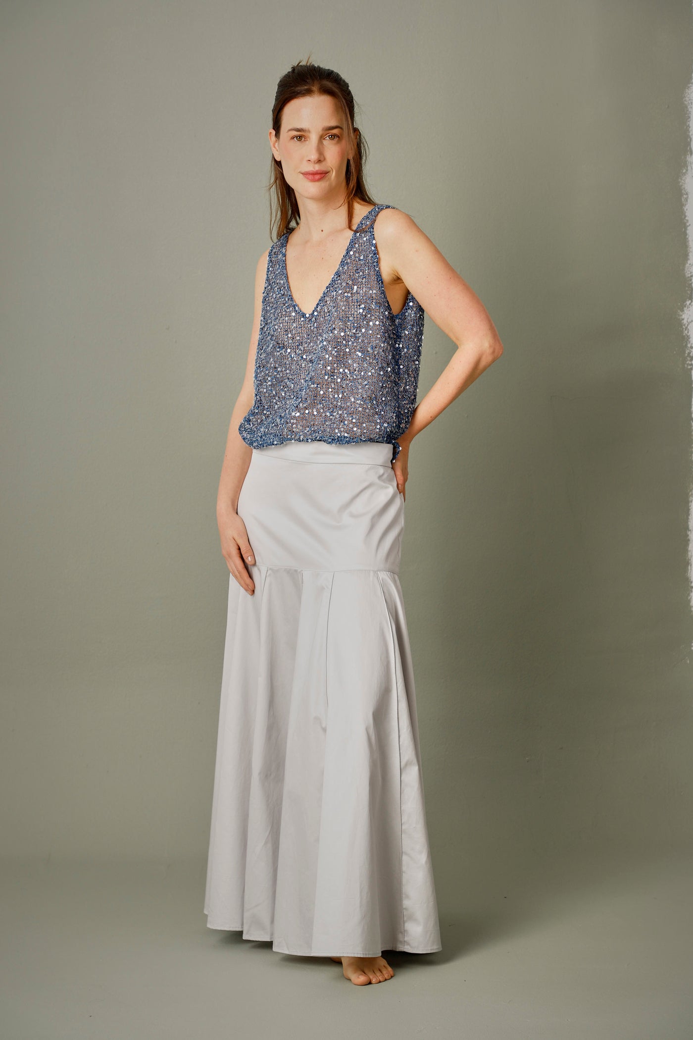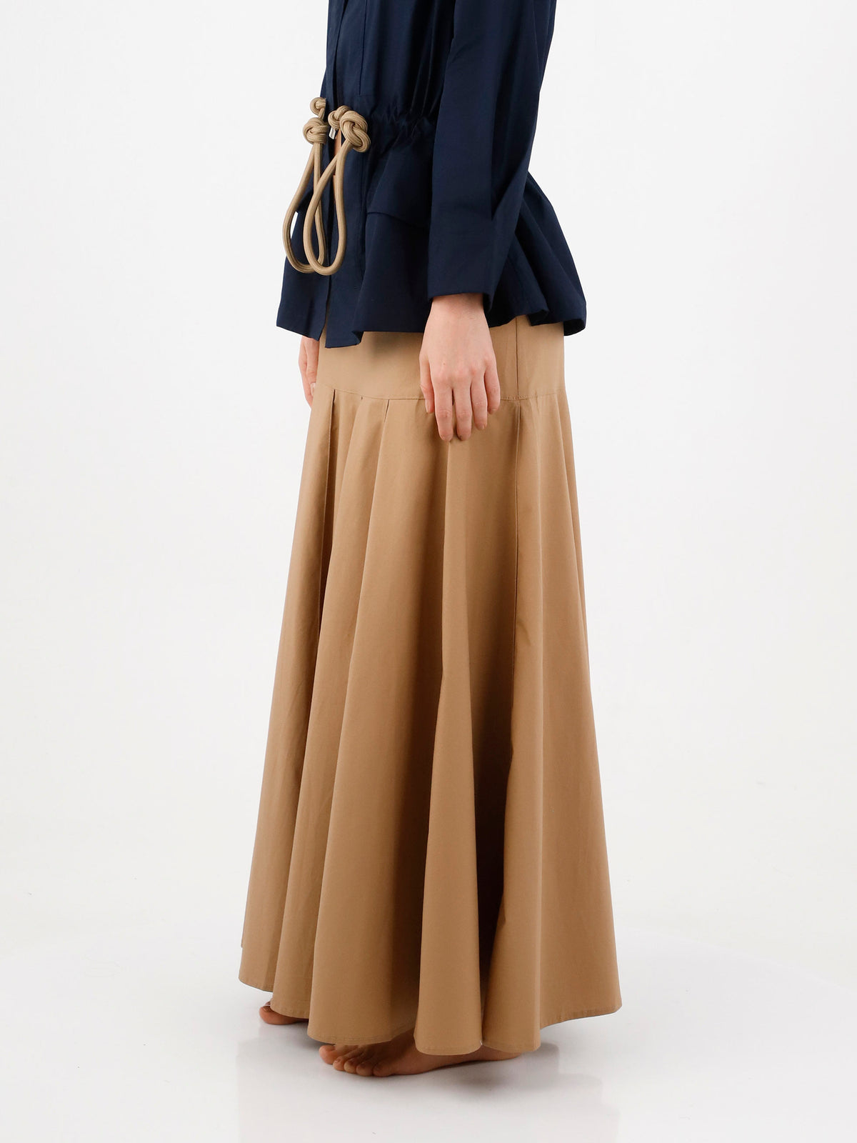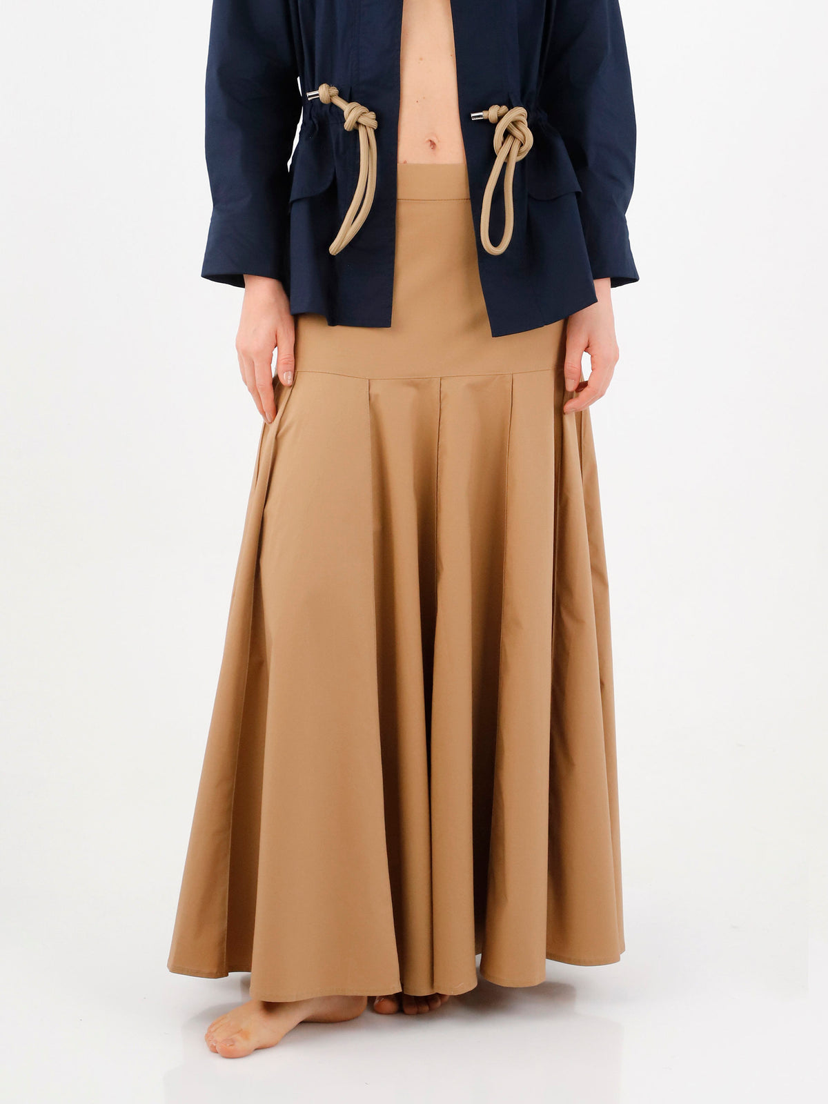 Falda larga con corte en la cadera, con nesgas y estilo campana que le da mucha amplitud abajo y un especial vuelo al caminar. Pretina con cierre y resorte atrás e Ideal para usar tanto en ocasiones formales o informales.