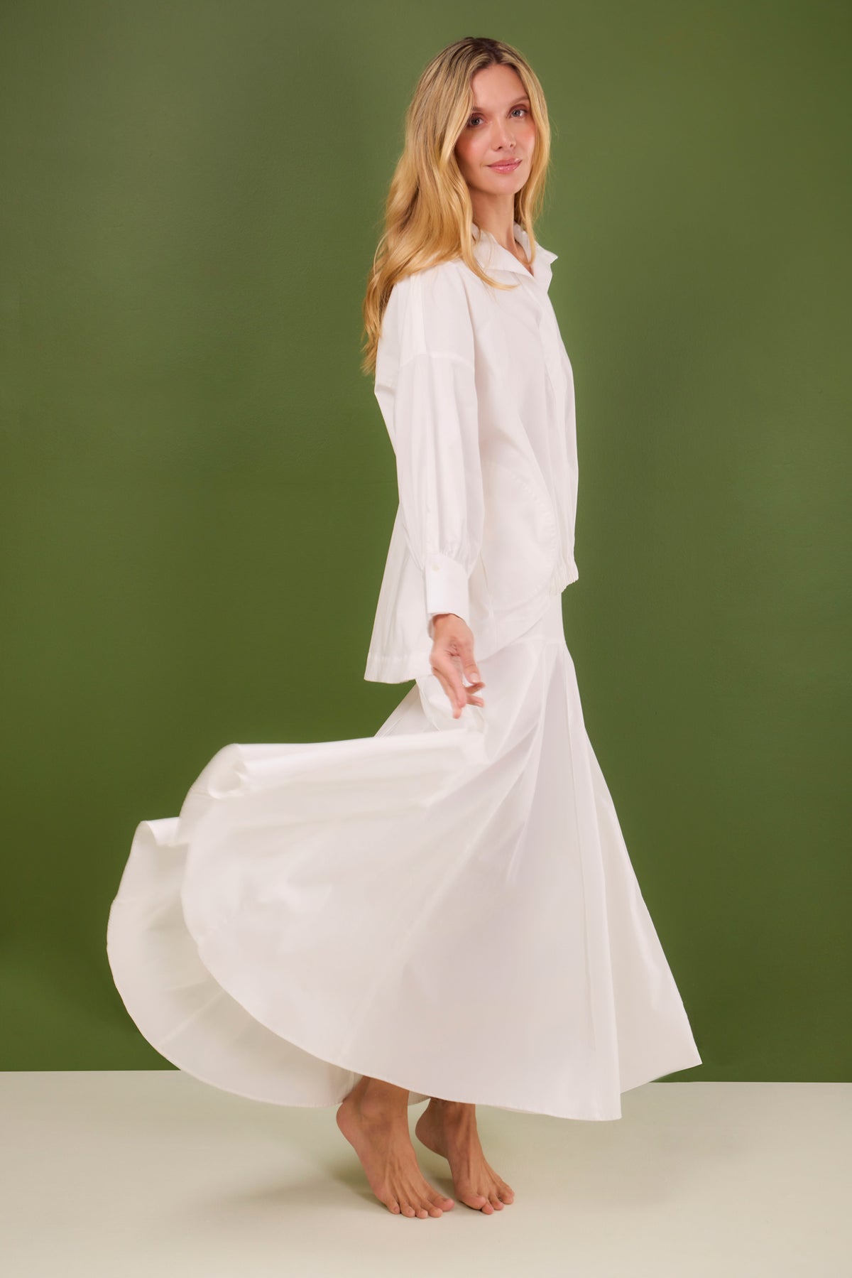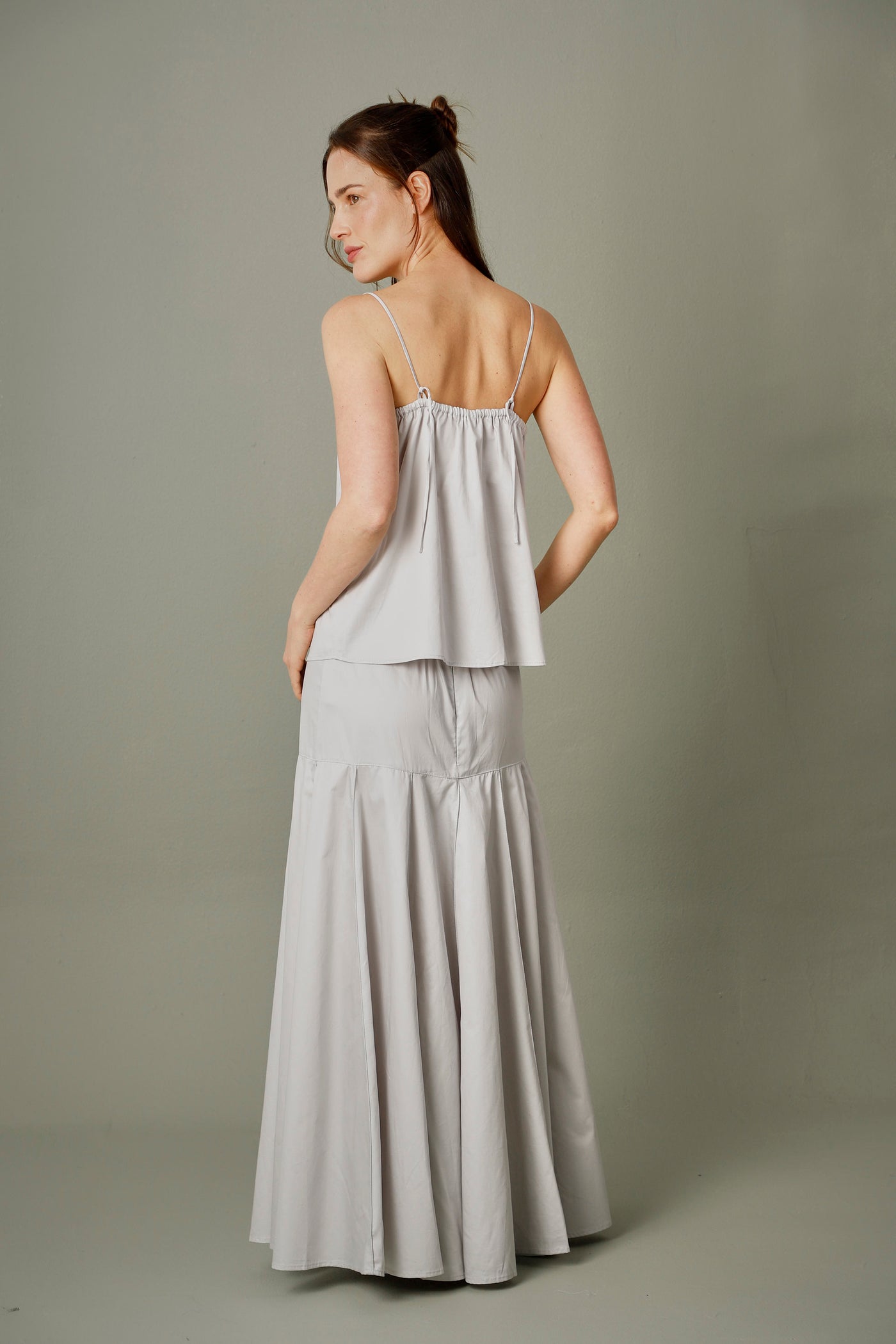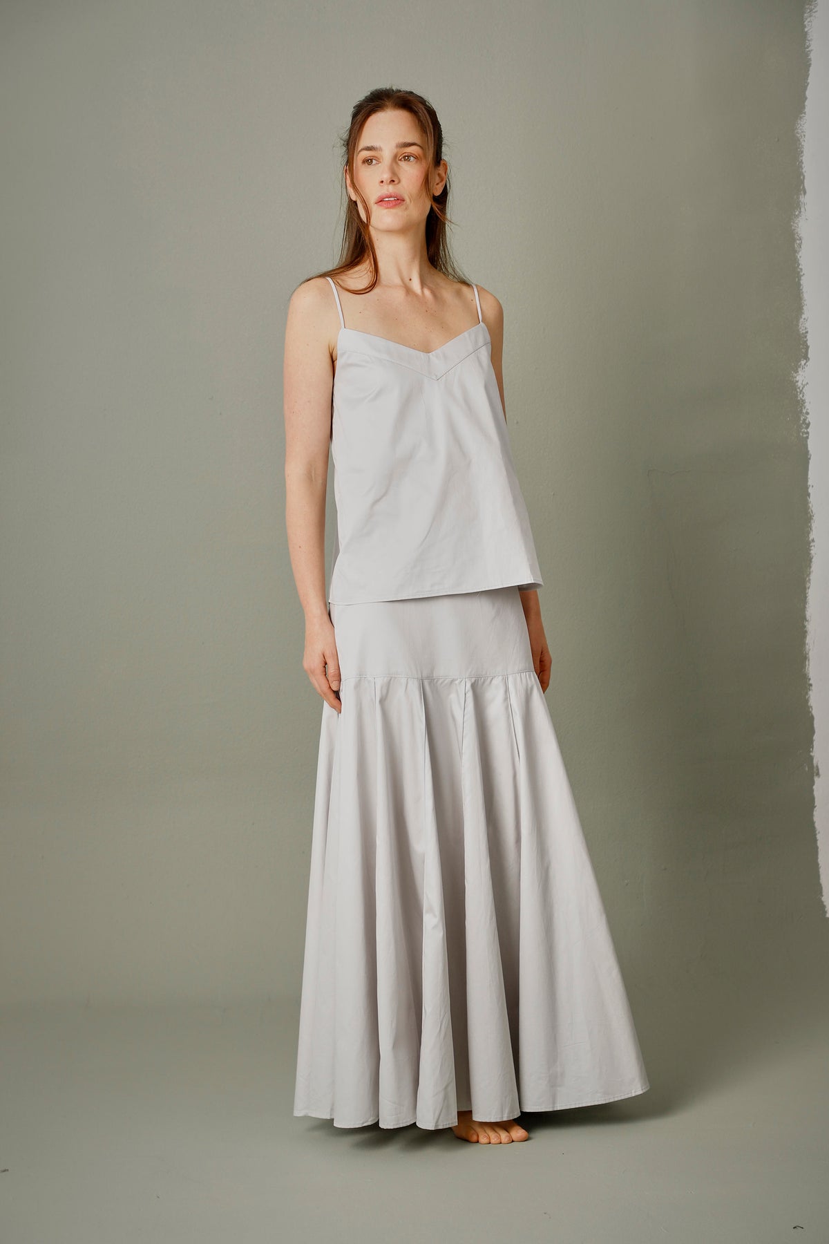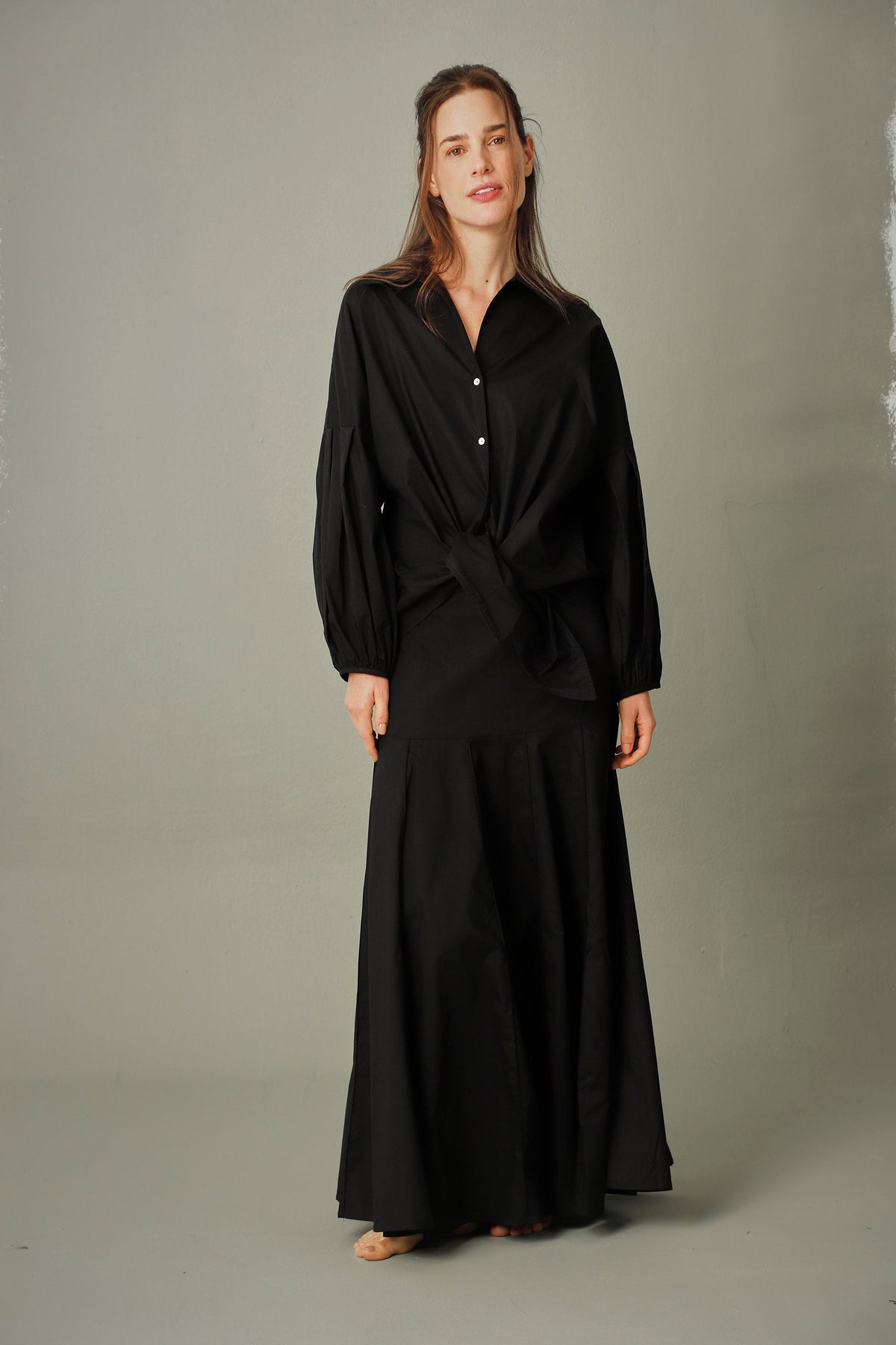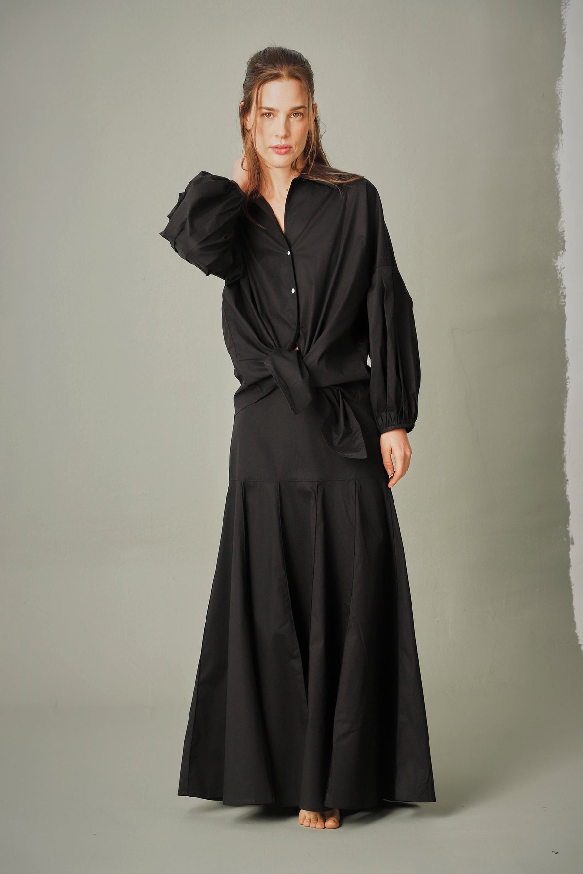 Falda larga con corte en la cadera, con nesgas y estilo campana que le da mucha amplitud abajo y un especial vuelo al caminar. Pretina con cierre y resorte atrás e Ideal para usar tanto en ocasiones formales o informales.