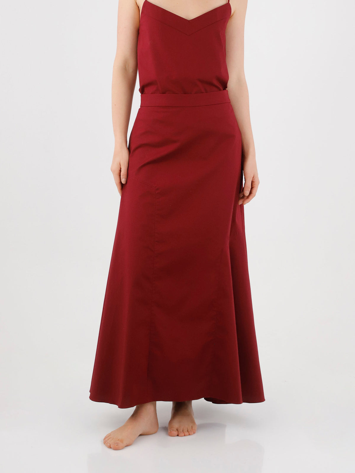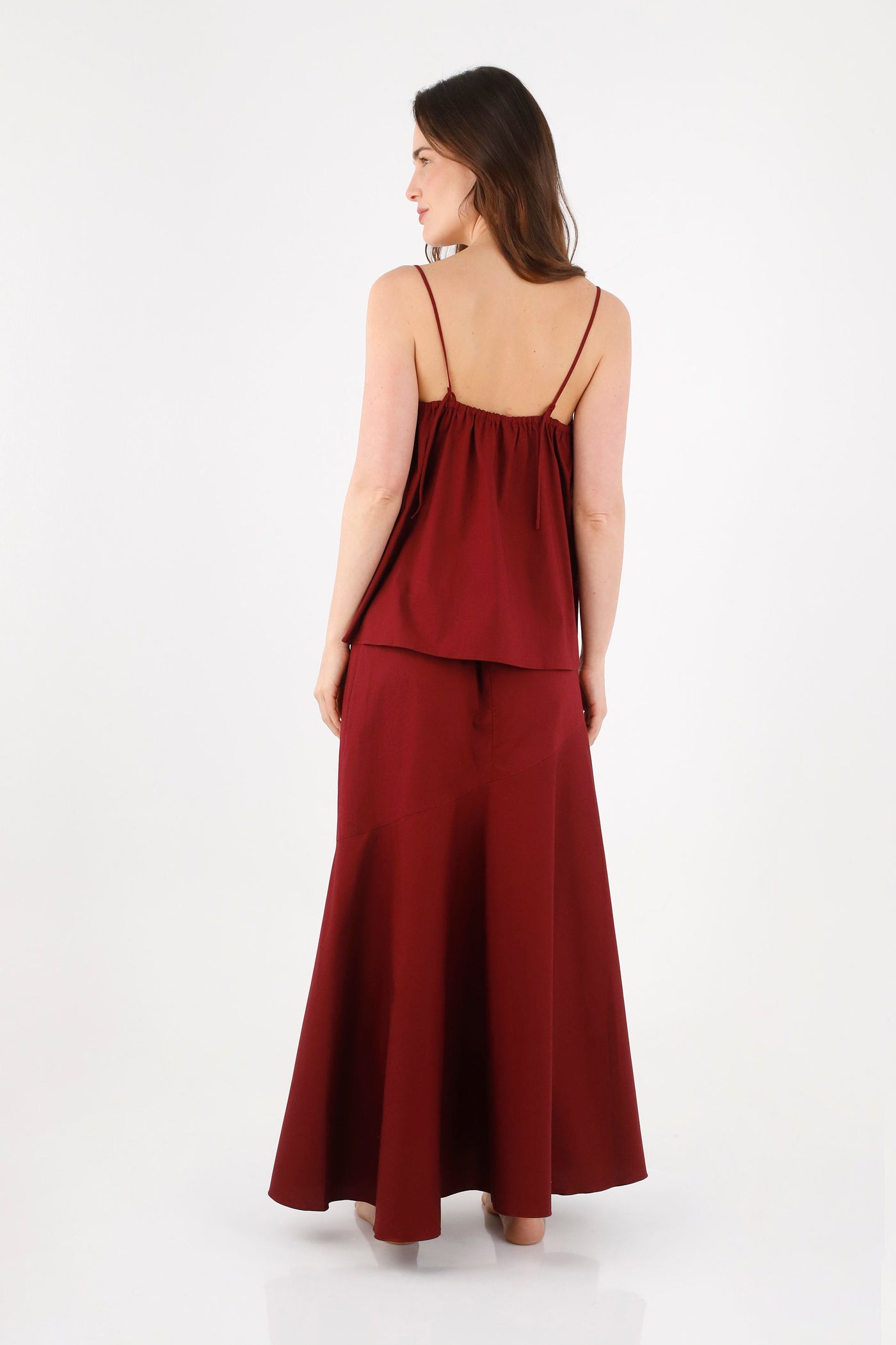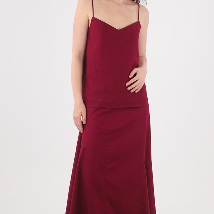 Falda larga, asimétrica, con falda campana atrás que da un vuelo especial al caminar, pretina con resorte y largo irregular. Ideal para usar tanto en ocasiones formales o informales.