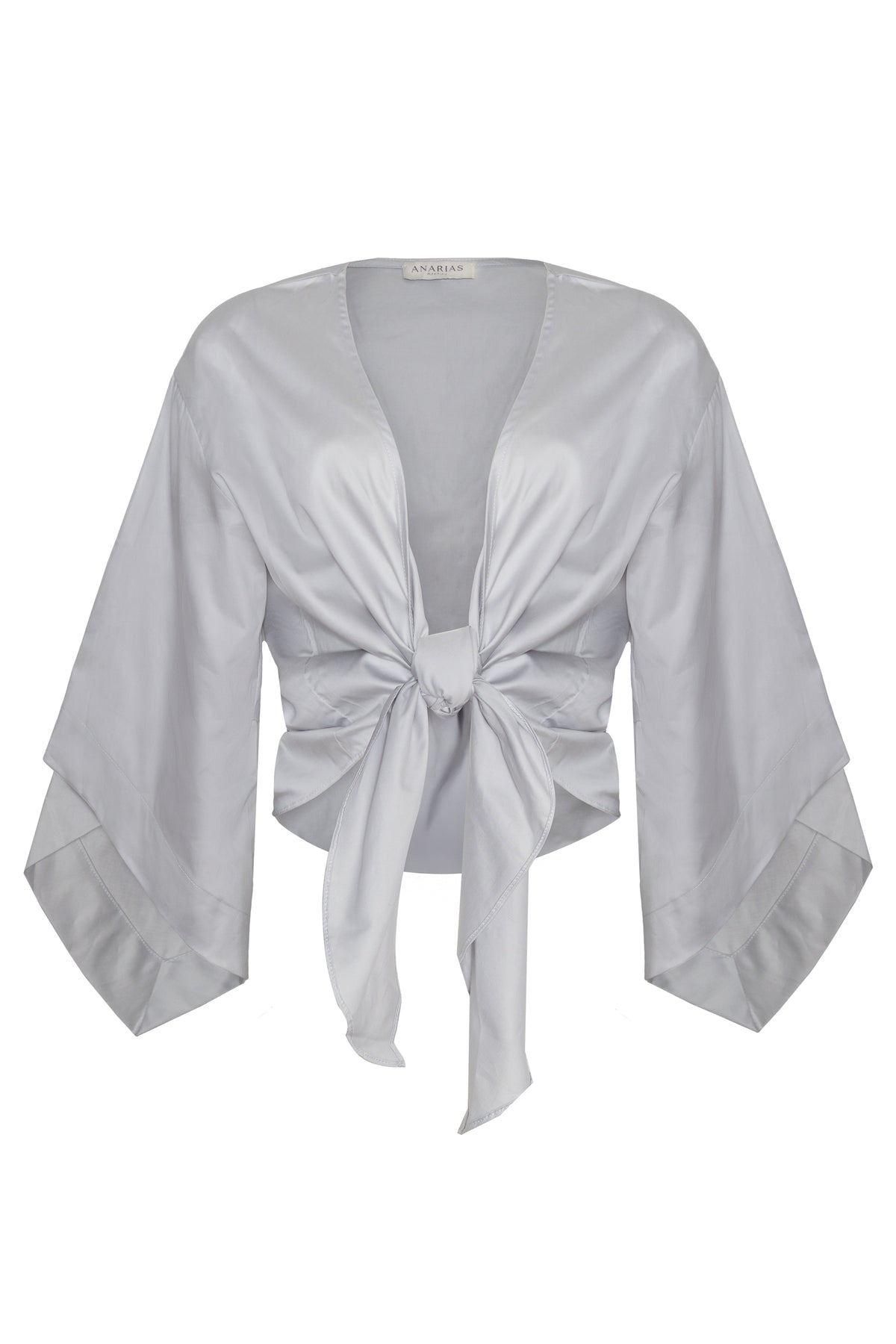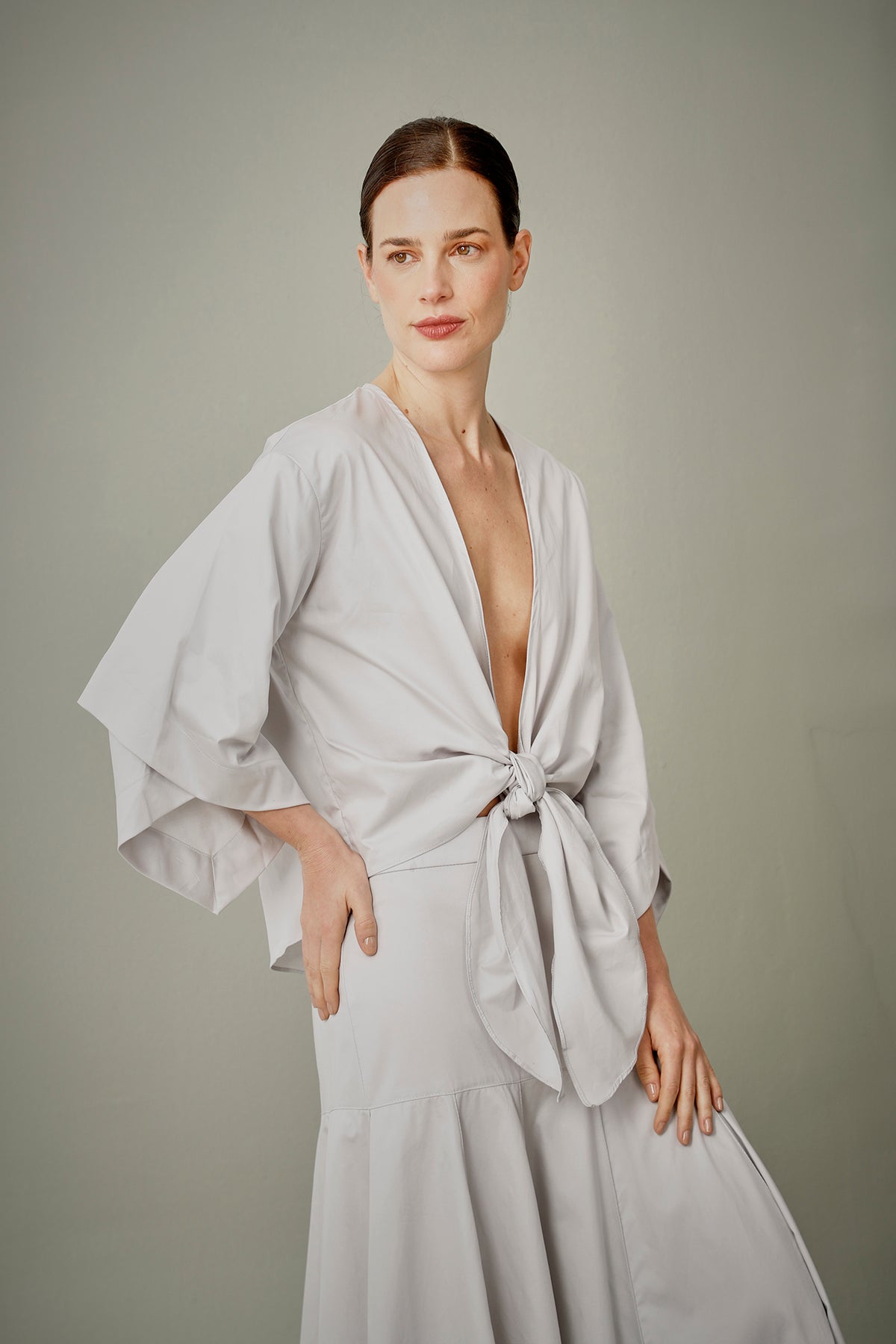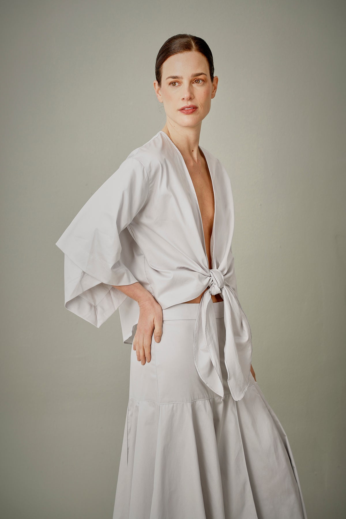 Kimono corto de amarrar con nudo, manga tres cuartos con una construcción muy especial terminada en punta, para usar con pantalones, faldas o sobre vestidos. Se puede usar con un top por debajo y más suelto si no queremos mostrar nada o super amarrado y sin top para un look más juvenil. Esta es una de esas prendas que vale la pena tener el closet por que solucionan y se adaptan a cualquier necesidad.