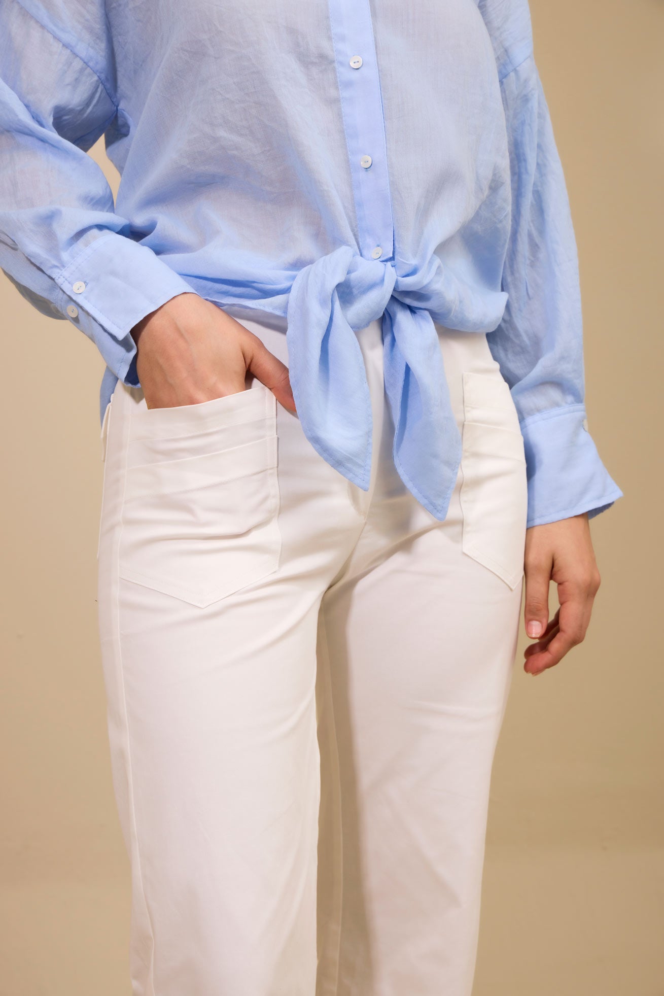 Pantalón largo, tiro medio con cierre, pretina enteriza y resorte posterior para mayor ajuste y comodidad, bolsillos frontales dobles y traseros de parche con tapa. Recto desde arriba hasta abajo con dobladillo grueso. Super confortable, pero a la vez con mucho estilo para sentirnos cómodas, pero bien arregladas.