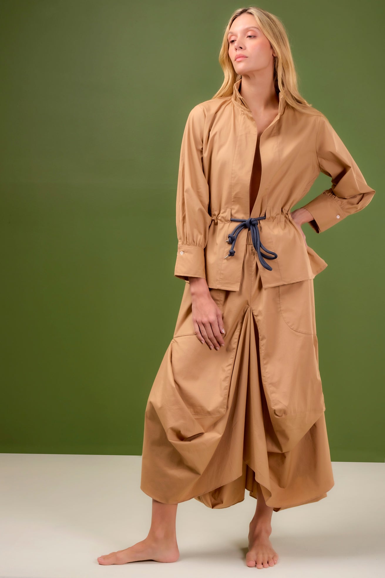 Chaqueta LETICIA, liviana tipo camisa, de cuello alto enresortado, sin abotonadura, manga larga con puño, con corte en la cintura y cordón con punteras plateadas para zurcir y ajustar. Úsala sin nada por debajo o si prefieres con una básica de tiras para más comodidad. ¡Esta silueta vuelve una vez más porque se convirtió en uno de nuestros básicos ya que es una de esas prendas que solucionan, funcionan bien para looks informales o formales dependiendo de los accesorios con la que la combines!