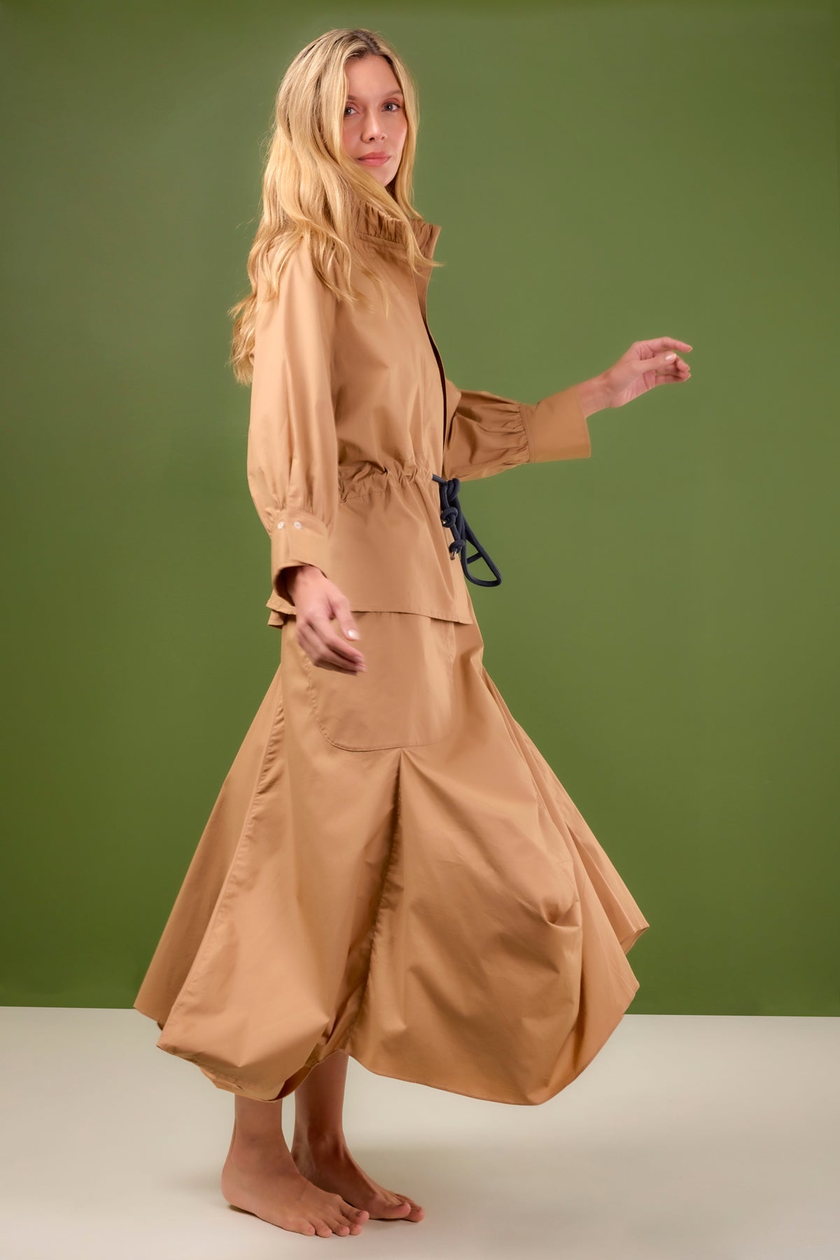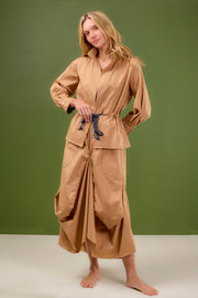 Falda MARIA, amplia, midi, de largo irregular, pretina de resorte, bolsillos y cortes diagonales tipo cargo. Ideal para usar tanto en ocasiones formales o informales. ¡Combínala tono a tono con nuestras camisas en el mismo tejido y logra un conjunto espectacular!