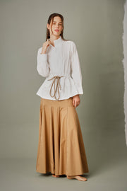 Falda Mareas; larga con corte en la cadera, con nesgas y estilo campana que le da mucha amplitud abajo y un especial vuelo al caminar. Pretina con cierre y resorte atrás e Ideal para usar tanto en ocasiones formales o informales.
