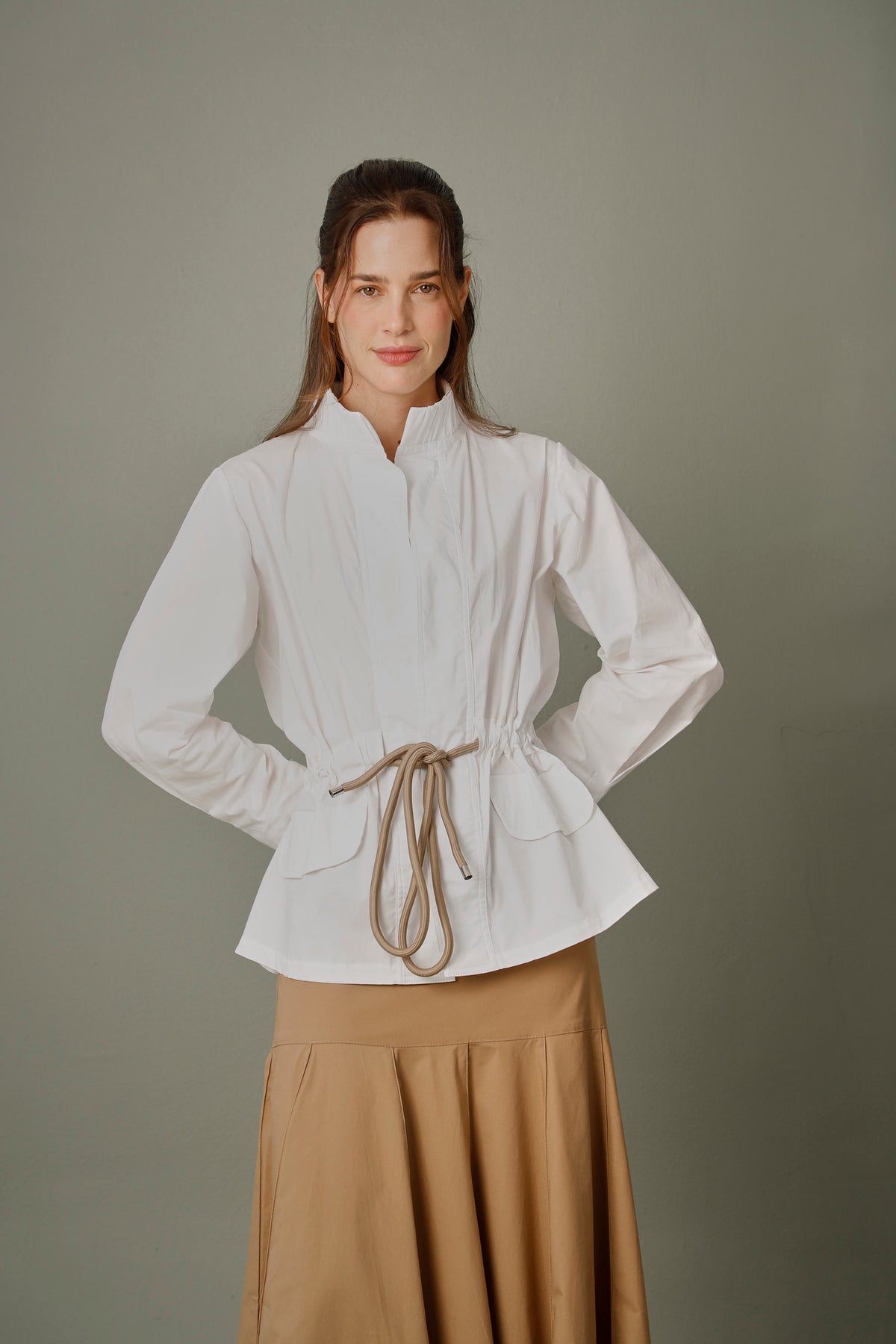 CAMISA CAPELLA; Chaqueta liviana tipo camisa, de cuello alto enresortado, sin abotonadura, con tapas que simulan bolsillos, manga larga con pliegues que abajo que generan ajuste, corte en la cintura y cordón con punteras plateadas para zurcir y ajustar.   Úsala sin nada por debajo o si prefieres con una básica de tiras para más comodidad.